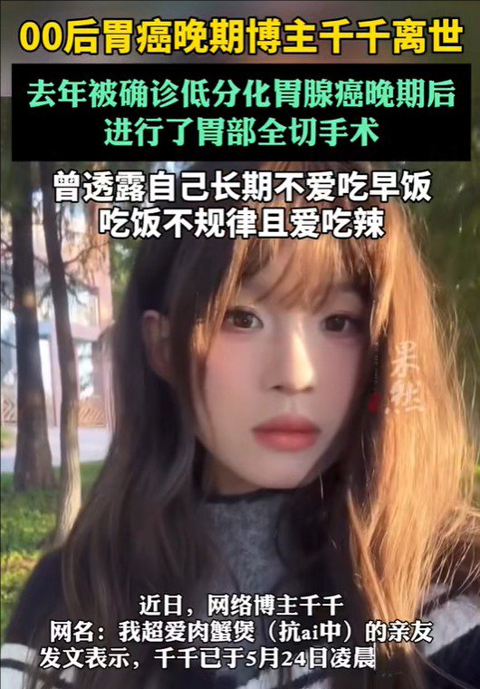 据了解,千千于2024年3月确诊低分化胃腺癌晚期后,进行了胃部全切手术。结疗一个月后,不幸复发,腹膜转移。她曾透露,自己长期不爱吃早饭 。吃饭不规律且爱吃辣,为了减肥晚饭吃的很随意。
