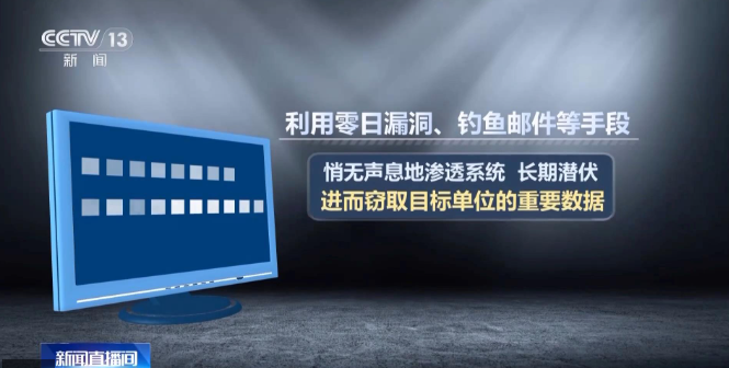 国家计算机病毒应急处理中心高级工程师 杜振华:APT攻击直译过来叫高级持续性威胁攻击,具体体现在它使用的漏洞,可能是一些利用难度比较大的漏洞,甚至是未知的漏洞。使用的这些木马病毒和网络武器,通常是自主开发的。攻击者在目标选择上,相较于普通网络攻击的随机性、发散性而言,对目标的选择专注度更高,可能对同一目标实施数月甚至长达数年的持续性攻击。
