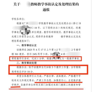 5月26日,有网民爆料称,广州某职业学院近期在校内发布了两起教学事故,一起为一名老师上课迟到1分钟,另一起为一名老师提前下课2分钟。迟到早退一两分钟被认定为教学事故,引发争议。27日,大皖新闻记者联系上该学院,工作人员答复称,被通报是因为触犯了学校的相关规定。“要是学校没有教学秩序,每个人都迟到早退,一两分钟,两三分钟,不就乱了嘛。”(据5月27日大皖新闻报道)