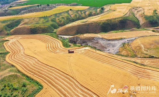 2024年6月24日,在新源县则克台镇则克台村的麦田里,随着大型收割机驶过,麦穗、秸秆有序分离,一颗颗麦粒从收割机出料口倾泻而下,装进运粮车里。张文庭摄
