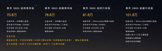 尊界S800官方建议零售价:尊界S800星辉尊享版70.8万元起,尊界S800星耀尊享版78.8万元起;尊界S800星辉行政版81.8万元起;尊界S800星耀行政版101.8万元起。全系可选智能星空顶、可变空间隔断(40英寸隐私巨幕、后排智能交互系统)、隐私光幕玻璃、电子后视镜、21英寸25孔日耀轮毂、20英寸12孔晖月轮毂。尊界S800首销期 即刻下定,预订权益可叠加 。赠送价值30000元华为ADS智能辅助驾驶系统高阶包权益 ;赠送价值至高30000元选配金权益 ;赠送随车尊享精品套装 ;赠送价值4000元智能辅助驾驶无忧服务权益 ;鸿蒙智行用户换购或增购可享40000元尾款减免权益;尊界S800先行者计划 ,6月26日开始交付,限量599台。8月中旬开始规模批量交付。