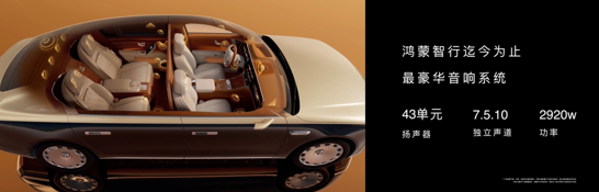尊界S800率先搭载HUAWEI SOUND ULTIMATE华为悦彰非凡系列音响系统,7.5.10独立声道、43单元扬声器与2920W澎湃功率。寰宇星轨音网设计搭配立体浮雕工艺,新一代星环散射体让高音更清澈,磐石门低音让低音更震撼。创新采用4座4扬头枕音响、10天空声道与空间音分轨模型,使声音精准度较传统提升54% ,实现每一座都是独立音乐厅的沉浸听音体验。