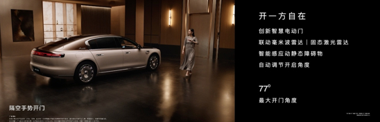 开一方自在,启一程尊贵。尊界S800的创新智慧电动门,联动毫米波雷达与固态激光雷达,智能感应动静态障碍物,自动调节开启角度,最大开门角度达77° ,支持隔空手势开关车门。引入NearLink华为星闪连接技术,定位精度较蓝牙钥匙方案提升5倍,解闭锁精准度提升6倍。星徽流转智能迎宾光毯与星光大道侧翼光毯 点亮,带来满满的科技感与仪式感。