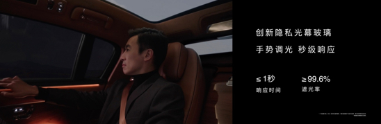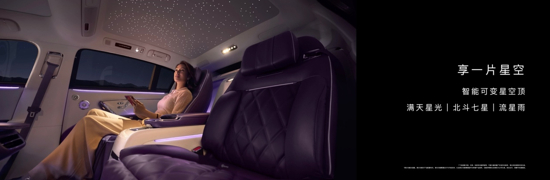 尊界S800座舱采用智能可变星空顶[1],呈现满天星光、北斗七星与流星雨特效。创新智能追光系统[2],追光灯分区布局点亮仪式感。全域环绕氛围灯隐藏式光源与内饰主题光色同韵,细腻光效如流动星空。前风挡采用三层纳米镀银技术,紫外线阻隔率大于99%。为用户带来前所未有的惬意体验。
