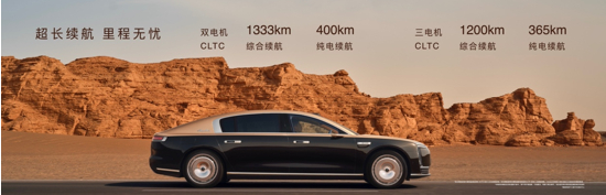 [43] 综合续航里程为增程版满油满电 CLTC 综合工况总续航里程,纯电续航里程为增程版版电池组的CLTC 综合工况续航里程。1200km为增程三电机选配R20轮胎时的续航数据。