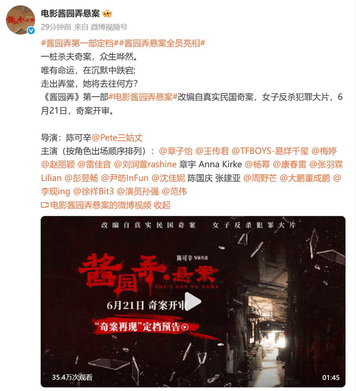 刚刚,章子怡主演电影《酱园弄·悬案》官宣定档6月21日!赵丽颖、杨幂、易烊千玺等角色海报曝光