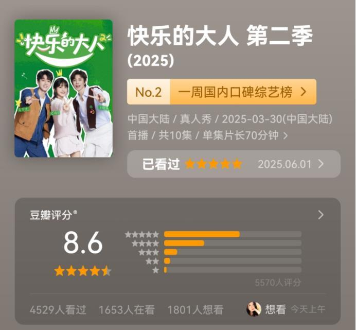 《快乐的大人2》以豆瓣开分8.6、一周口碑综艺榜TOP1的成绩延续了第一季的超高口碑。节目通过沈月、王敬轩、吴宇恒三位好友真实、松弛、充满烟火气的日常相处,向观众精准传递了“快乐并非是遥不可及的奢望”,它蕴藏在真诚友谊、微小确幸与享受当下之中,是一种选择与能力。