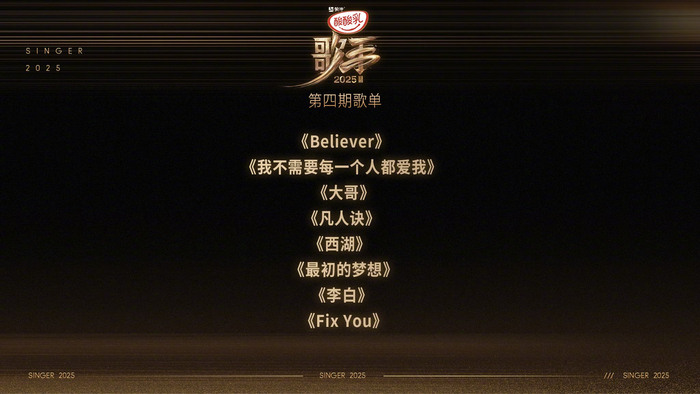 与此同时,节目官方微博还在5日公布了第四期歌单,分别是:《Believer》《我不需要每一个人都爱我》《大哥》《凡人诀》《西湖》《最初的梦想》《李白》《Fix You》。