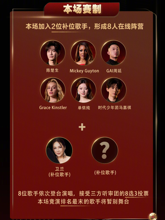 据悉,卫兰与范玮琪将同陈楚生、米奇·盖顿(Mickey Guyton)、GAI周延、格瑞丝·金斯勒(Grace Kinstler)、单依纯、马嘉祺形成8人在线阵营。根据本期节目赛制,这8位歌手将依次登台演唱,接受三方听审团的8选3投票。本场竞演排名最末的歌手将暂别舞台。