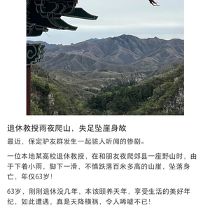 日前有多名网友网上发文称,河北保定驴友群发生一起令人心痛的惨剧:一位本地高校63岁退休教授,在和朋友夜爬郊县一座野山时,由于下着小雨,脚下一滑,跌落山崖不幸身亡。