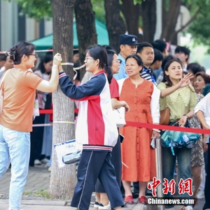 资料图:2024年6月7日,湖北省武汉市长虹中学考点,考生入场前与送考老师击掌。张畅 摄