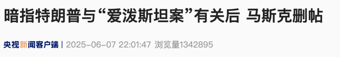据央视新闻6月7日晚最新消息,马斯克近日在与美国总统特朗普激烈公开争执期间,在社交媒体上发布了一则帖文,暗示特朗普与“爱泼斯坦案”有关联。如今,这条帖文已被马斯克删除。
