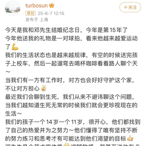 她写道,她和邓超的两个孩子,儿子14岁,女儿11岁,都已经找到了自己的热爱并为之努力,而她与邓超的生活也越来越规律,“有空的时候送完孩子上校车,然后一起遛弯去喝杯咖啡看看路人聊个天。当我们有一方有工作时,对方也会好好守护这个家,不让对方担心。”