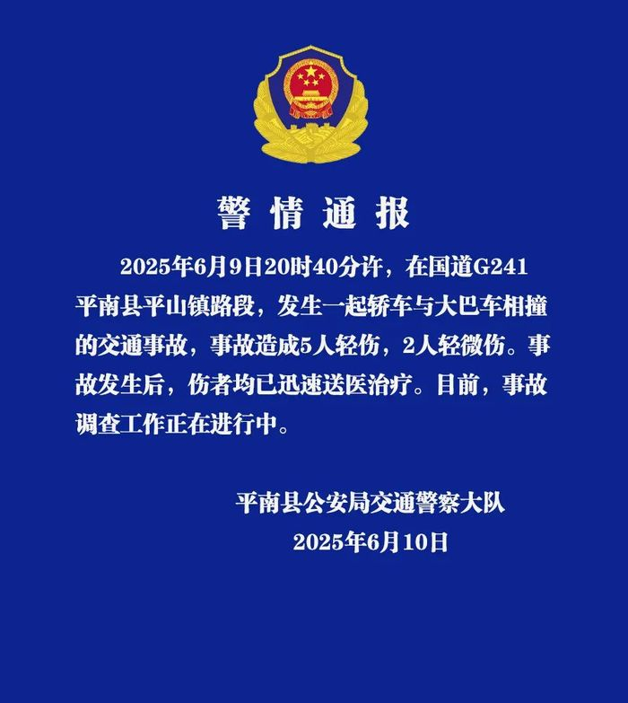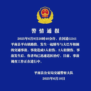 6月10日,广西贵港平南公安通报,6月9日20时40分许,在国道G241平南县平山镇路段,发生一起轿车与大巴车相撞的交通事故,事故造成5人轻伤,2人轻微伤。事故发生后,伤者均已迅速送医治疗。目前,事故调查工作正在进行中。