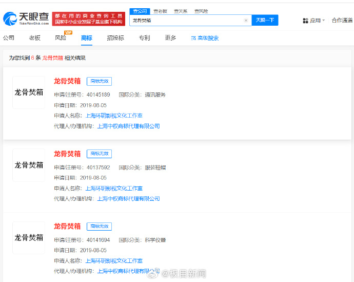 极目新闻记者注意到,“龙骨焚箱”的潜在价值早就被人注意。天眼查知识产权信息显示,上海环玥影视文化工作室曾于2019年申请注册多枚“龙骨焚箱”商标,国际分类包括等通讯服务、服装鞋帽、科学仪器等,当前上述商标均已被驳回,处于无效状态。