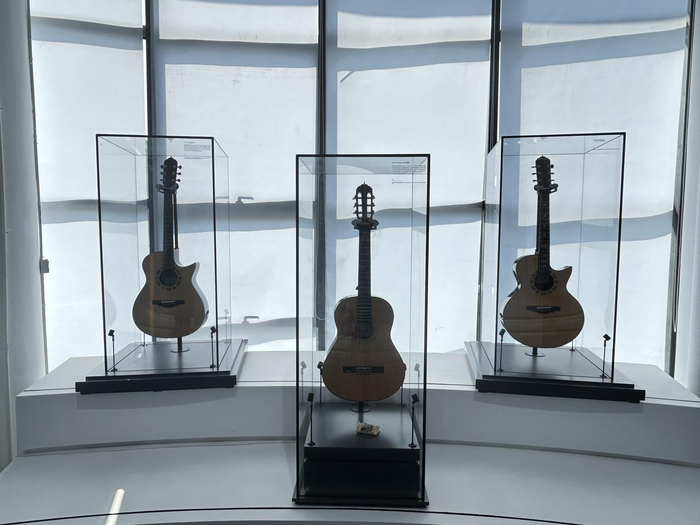 记者在该博物馆看到,目前展出的吉他不仅有古典吉他、民谣吉他,还有大师制作的百年老琴、融合四川文化元素的吉他。其中有一把名为“山水堰”的吉他,采用掐丝珐琅的工艺在琴背雕琢出都江堰的实景航拍图,历经一年打造。