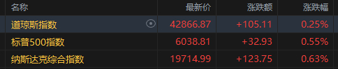 截至收盘,道琼斯指数涨0.25%,报42,866.87点;标普500指数涨0.55%,报6,038.81点;纳斯达克综合指数涨0.63%,报19,714.99点。
