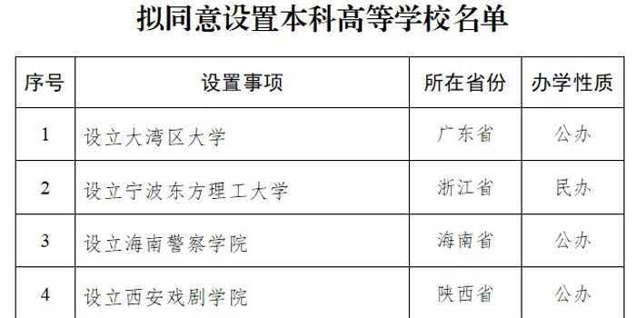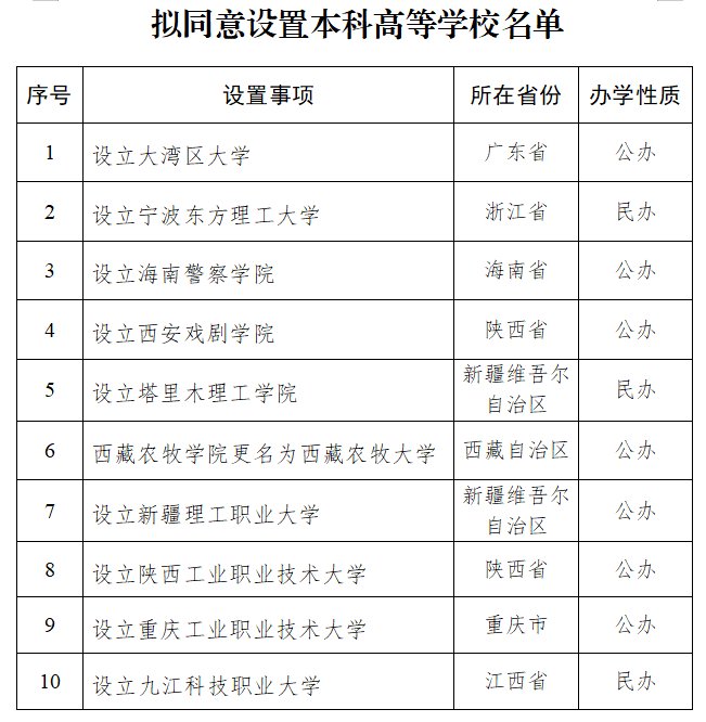 新京报讯 据教育部消息,根据《中华人民共和国高等教育法》《普通高等学校设置暂行条例》《普通本科学校设置暂行规定》《本科层次职业学校设置标准(试行)》等有关规定以及第八届全国高等学校设置评议委员会考察评议结果,经教育部党组会议审议,拟同意设置大湾区大学等10所学校,现予公示。
