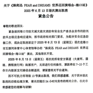 新京报讯 据海口发布官微消息,陈奕迅FEAR and DREAMS世界巡回演唱会-海口站2025年6月13日场次演出取消,详情:
