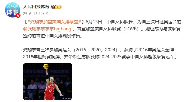 据人民日报体育消息,6月13日,中国女排队长、为国三次出征奥运会的龚翔宇 ,官宣加盟美国女排联赛(LOVB)。她也成为与该联赛签约的首位中国女排现役球员。