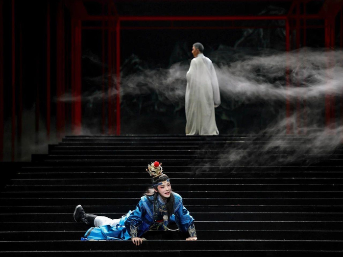 剧中,除了演员的唱腔,陈丽君扮演的贾宝玉“滚楼梯”的片段,成了令人揪心的“名场面”。因协助蒋玉菡藏身得罪了忠顺王,宝玉挨了父亲的打,从舞台上长长的台阶滚下来。这数十个台阶,陈丽君排练时滚过无数次,才有了对肢体的精准掌控力,有了情绪的层层递进。少年宝玉的倔强、无奈、绝望,都随着这一级级台阶展现出来。
