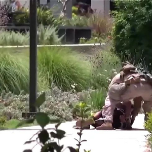 当地时间周五,英媒路透社在威尔希尔联邦大楼拍摄到海军陆战队队员拘捕一名黑人男子的画面。视频显示,军方人员用束线带捆绑男子的双手,随后将他移交给美国国土安全部的文职人员。