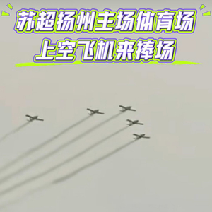 比赛开始前,5架飞机从扬州体育公园体育场正上空飞过,时而排成箭型、时而排成一字型,机尾拉出彩色烟雾,引发现场球迷的热烈欢呼。