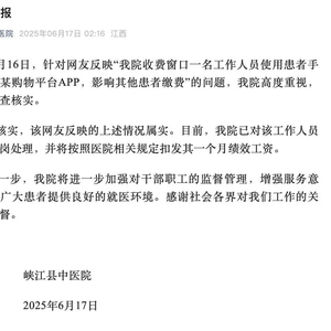 6月16日,针对网友反映“我院收费窗口一名工作人员使用患者手机下载某购物平台APP,影响其他患者缴费”的问题,我院高度重视,立即调查核实。经核实,该网友反映的上述情况属实。目前,我院已对该工作人员作出停岗处理,并将按照医院相关规定扣发其一个月绩效工资。