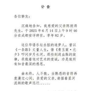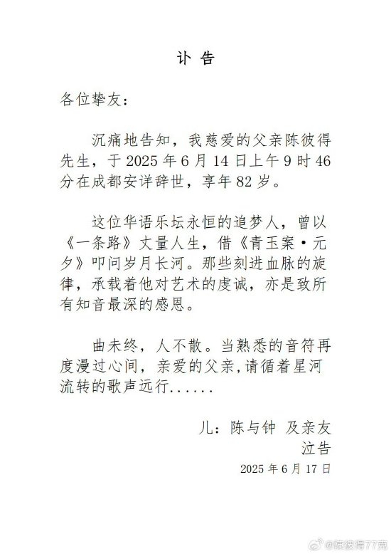 6月17日上午,陈彼得家人发布讣告称,陈彼得先生,于2025年6月14日上午9时46分在成都安详辞世,享年82岁。讣告提到:“这位华语乐坛永恒的追梦人,曾以《一条路》丈量人生,借《青玉案·元夕》叩问岁月长河。那些刻进血脉的旋律,承载着他对艺术的虔诚,亦是致所有知音最深的感恩。曲未终,人不散。当熟悉的音符再度漫过心间,亲爱的父亲,请循着星河流转的歌声远行……”得知此消息,记者采访到曾与他相识的友人彭先生。他表示,这位老人值得尊重。他的一举一动都是爱国热情的流淌和对音乐以及传统文化的热爱。陈彼得,原名陈晓因,1943年8月12日出生于中国四川成都,祖籍广东潮阳,长于中国台湾眷村,是流行乐男歌手、作曲家及唱片制作人。读书时代他自学吉他,成了中国台湾最早的歌手之一。