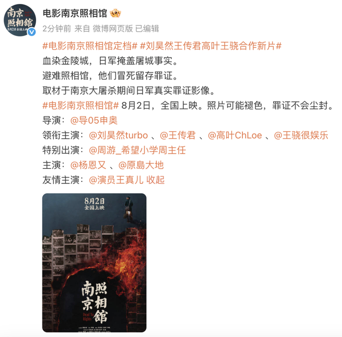 6月19日,导演申奥新作电影《南京照相馆》宣布将于暑期档8月2日全国上映,并发布定档海报。