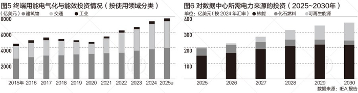 终端用能电气化与能效投资在过去10年间近乎翻倍,2025年将达8000亿美元。在交通领域,全球范围内电动汽车的销售推动投资增长;在建筑领域,高效家电与制冷系统需求上升。工业领域电气化与能效投资因政策支持与技术进步持续增长,中国、欧盟、美国为主要市场。