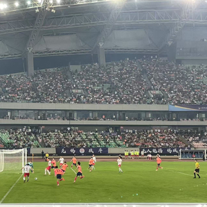 比赛开球不久,体育场就被淮安队的球衣染成红色,像是烈焰在燃烧。鼓声、加油声、喇叭声混在一起,每当主队带球进攻,场内的加油声就会山呼海啸般袭来。