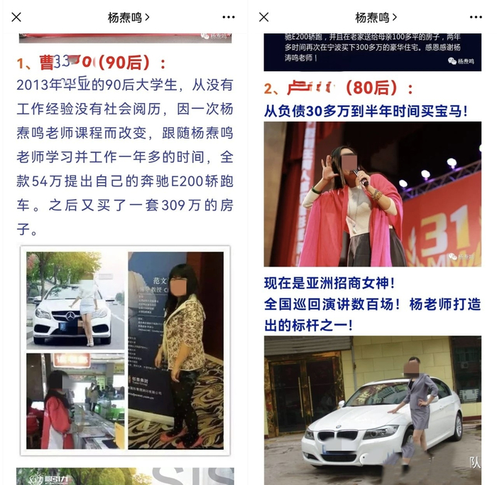 类似的案例还有“月收入只有5000元的小会计,结缘杨涛鸣后,年薪突破300万”“没有阅历的大学生,在杨涛鸣的指点下,一年多时间全款50多万提奔驰,两年多时间在宁波买下豪华住宅”等。