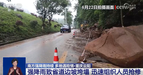 从本月18日开始,重庆云阳县出现持续强降雨。22日上午,云阳县境内省道的一处路段发生边坡垮塌,导致道路受阻,当地多部门迅速组织人员前往现场处置。