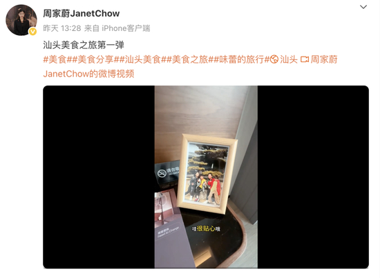 6月23日,周家蔚在微博上分享了汕头美食之旅,在酒店房间的床头柜上,可以看到摆放着的一家四口的合影。