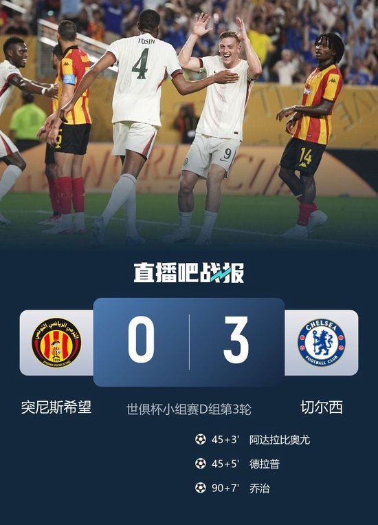 直播吧6月25日讯 北京时间9:00,世俱杯小组赛D组第3轮突尼斯希望vs切尔西,比赛在林肯金融体育场打响!上半场,霍尔头球攻门造险!半场补时阶段,恩佐2分钟助攻双响!阿达拉比奥尤、德拉普破门!下半场,皮球击中梅里亚赫手臂,主裁场边观看回放后表示没有点球!补时阶段,乔治远射,对手门将黄油手将球漏进球门!最终,切尔西3-0击败突尼斯希望,小组第二出线,1/8决赛将对阵本菲卡;突尼斯希望排名小组第三出局。