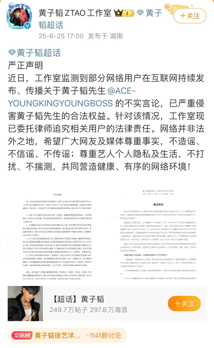 25日17:00,黄子韬工作室发布严正声明,表示当下网络上有关“代孕生子”的传闻已严重侵害黄子韬的合法权益。声明中提到,所谓“黄子韬、徐艺洋夫妇涉及代孕”的传闻,纯属恶意捏造的虚假信息,完全背离事实。