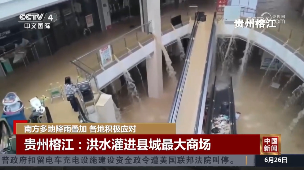 受持续强降雨和上游来水影响,贵州榕江县和从江县24日先后经历洪峰过境,县城多地被淹。有居民在社交平台发布了一段榕江县最大商城被淹的视频。视频中,商场内部,水沿着电梯向下流,一楼商铺被淹没了一半多。据了解,在洪水到来前,为了保证员工们的安全,商场全体人员已经被安全撤离。