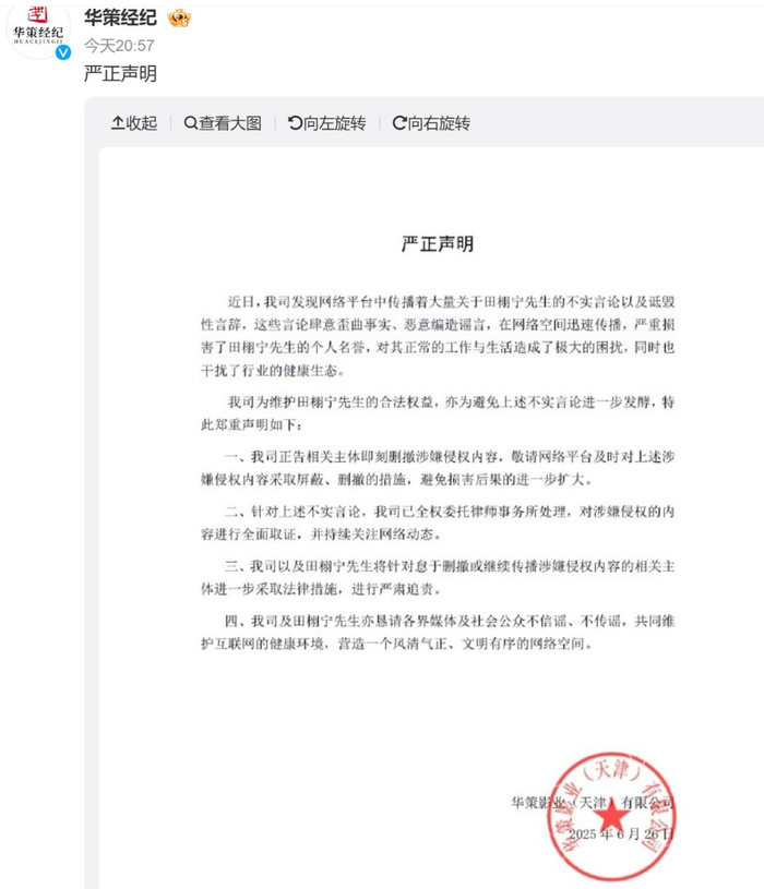 对此,华策经纪发声明回应,称网络平台中传播着大量关于田栩宁的不实言论以及诋毁性言辞,“这些言论肆意歪曲事实、恶意编造谣言”,正告相关主体即刻删撤涉嫌侵权内容,表示已委托律师进行全面取证。