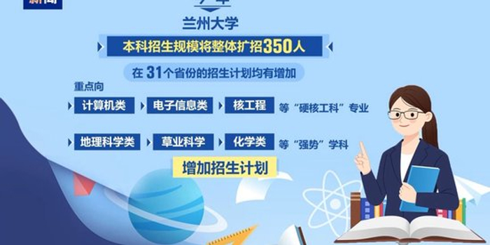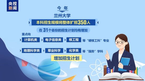 今年,优质本科高校招生计划进一步扩大,各高校继续推进学科专业优化调整,一批专业“上新”,一批专业“停招”,匹配人才供需。以兰州大学为例,本科招生规模将整体扩招350人,在31个省份的招生计划均有增加,重点向计算机类、电子信息类、核工程等“硬核工科”专业,以及地理科学类、草业科学、化学类等“强势”学科增加招生计划。