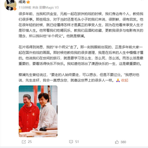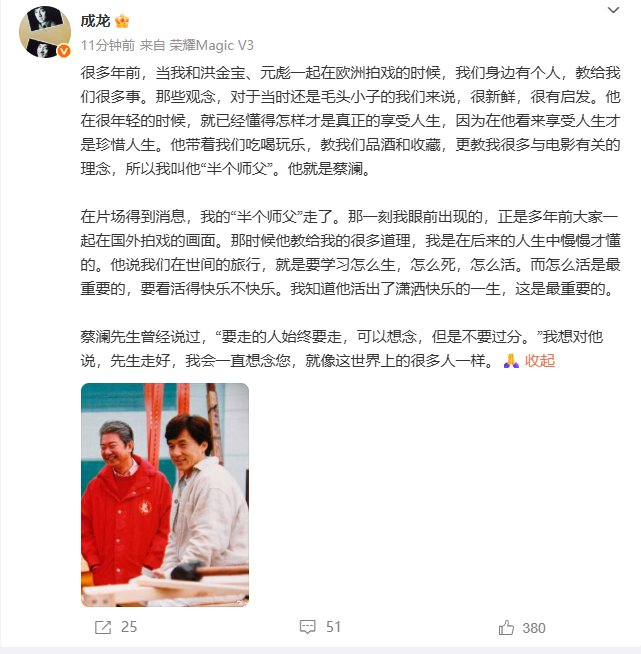[#成龙说我的半个师父走了#]#成龙发长文追忆蔡澜#@成龙 :发长文悼念蔡澜:很多年前,当我和洪金宝、元彪一起在欧洲拍戏的时候,我们身边有个人,教给我们很多事。那些观念,对于当时还是毛头小子的我们来说,很新鲜,很有启发。他在很年轻的时候,就已经懂得怎样才是真正的享受人生,因为在他看来享受人生才是珍惜人生。他带着我们吃喝玩乐,教我们品酒和收藏,更教我很多与电影有关的理念,所以我叫他“半个师父”。他就是蔡澜。