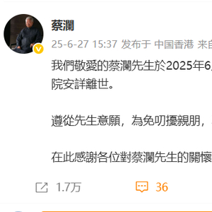6月27日,蔡澜个人微博账号发布讣告,称:“我们敬爱的蔡澜先生于2025年6月25日,在亲友陪同下,于香港养和医院安详离世。遵从先生意愿,为免叨扰亲朋,不设任何仪式,遗体已火化。”消息一出,网友纷纷悼念:“一路走好!”