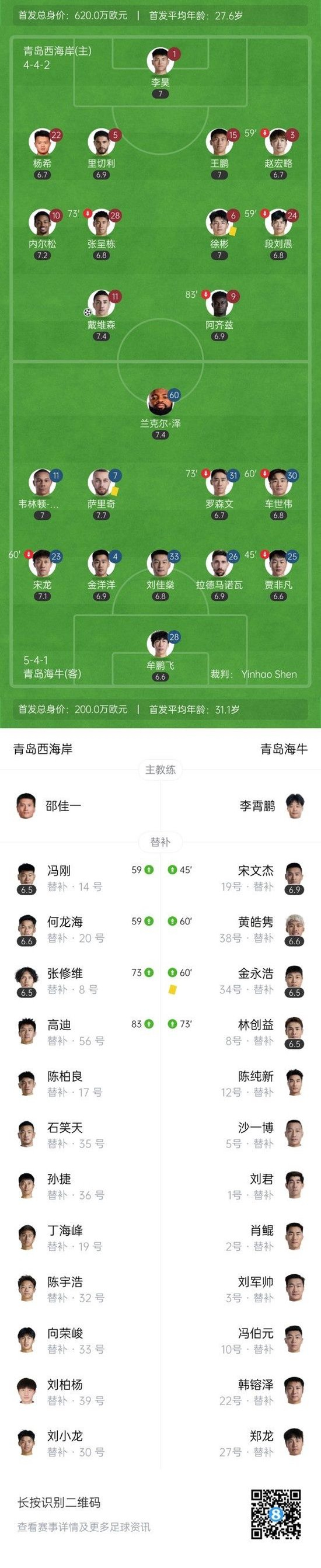 下半场补时5分钟,青岛西海岸1-0青岛海牛。