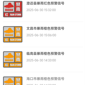 据海南澄迈县气象台2025年6月30日15时32分发布暴雨红色预警信号:澄迈县永发镇、瑞溪镇1小时内降雨量将达90毫米以上,3小时内降雨量或将达150毫米以上,12小时内降雨量或将达200毫米以上,建议有关单位和人员做好防范工作,各级各类学校停课。