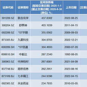 中毅达(600610)、中洲特材(300963)、路桥信息(837748)、七丰精工(873169)、永安药业(002365)等上半年股价涨幅均超过200%,分别达到了287.23%、267.61%、262.30%、244.94%、234.79%。