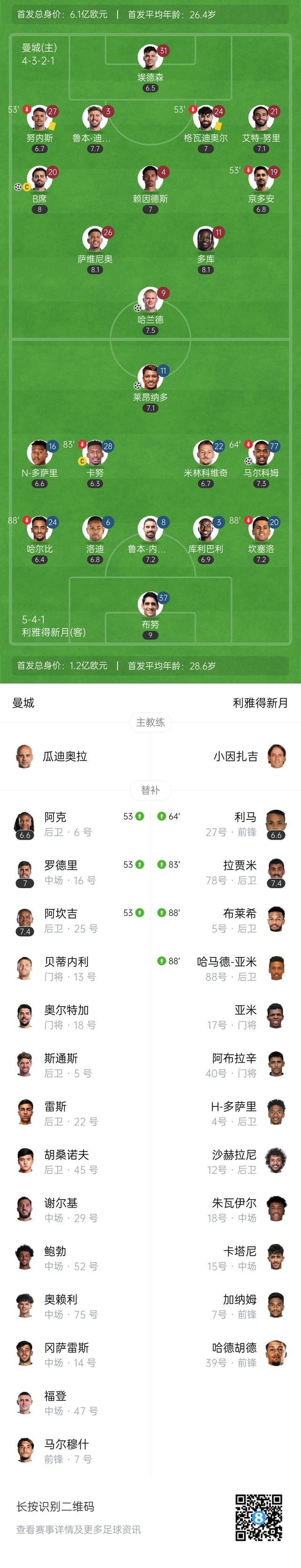 第55分钟,曼城左侧角球机会,B席主罚开到禁区内,混乱中哈兰德左脚打穿近角破门!曼城2-2扳平新月↓