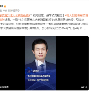 [韦东奕晋升北大长聘副教授?校方回应:按学校流程走]近日,一则“韦东奕晋升北大长聘副教授”的消息在网络热传,引发热议。相关内容显示,北京大学数学科学学院关于韦东奕助理教授的考核申请公示内容《北京大学届满评估评审表》共有9页,公示时间为2025年4月7日至4月11日,该公示意味着韦东奕已经通过北大数院的考核,如果没有其他异议,公示结束后,韦东奕将会被聘为长聘副教授。