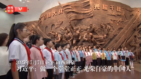 7日下午,习近平总书记来到山西省阳泉市,向百团大战烈士敬献花篮,参观百团大战纪念馆。在纪念馆大厅,习近平同青少年学生和纪念馆工作人员亲切交流。他对大家说,今天来到这里有特殊意义。七七事变是全民族抗战的开始,中国共产党是全民族抗战的中流砥柱,百团大战让全世界看到了中国共产党和中国人民抗战的意志和力量。我们坚持14年抗战,作出了巨大牺牲。前事不忘,后事之师。孩子们要争做民族的脊梁,一定要把我们国家建得强盛起来,要为全世界的和平作贡献。希望寄托在你们身上,未来是属于你们的。希望你们好好努力、奋发图强,做一个堂堂正正、光荣自豪的中国人。