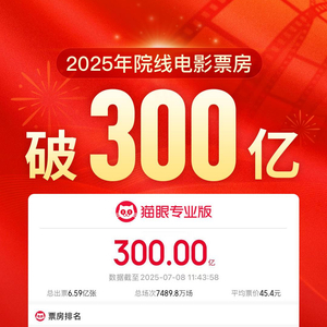 据猫眼专业版数据,2025年7月8日11时43分,2025年度票房(含预售)破300亿,快于2024年28天到达。年度票房榜前十电影中国产电影占9部,《哪吒之魔童闹海》《唐探1900》《封神第二部:战火西岐》分列年度票房榜前三位,其中《哪吒之魔童闹海》年度票房占比超51%持续领跑!