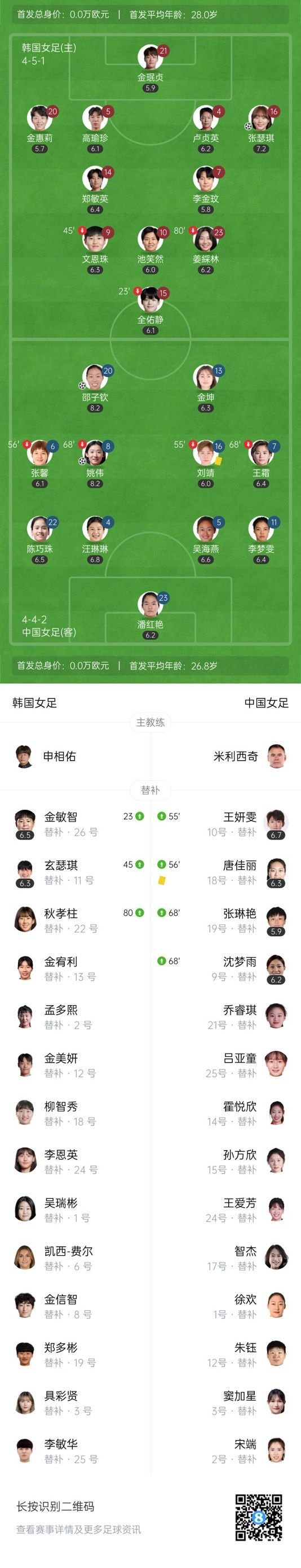 下半场补时5分钟,韩国女足2-2中国女足。